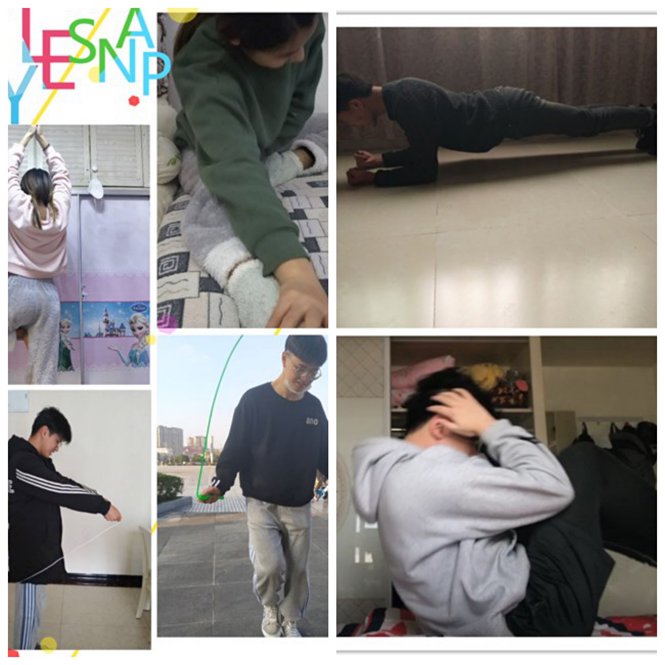 其他小伙伴也开启了室内健身操、跳绳、瑜伽、平板支撑、卷腹等运动项目。