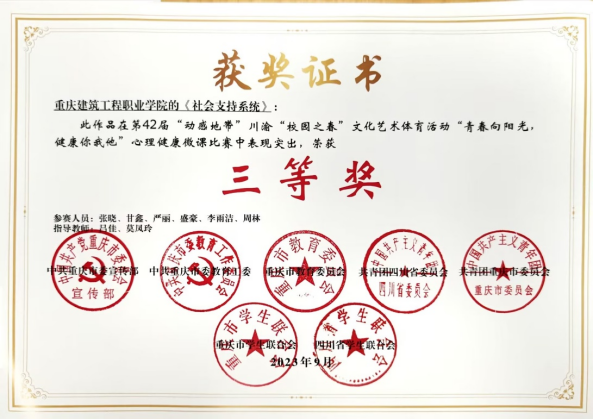 我校《社会支持系统》作品(指导教师:吕佳、莫凤玲;参赛人员:张晓、甘鑫、严丽、盛豪、李雨洁、周林)在第42届“动感地带”川渝“校园之春”文化艺术体育活动“青春向阳光,健康你我他”心理健康微课比赛中表现突出,荣获三等奖。