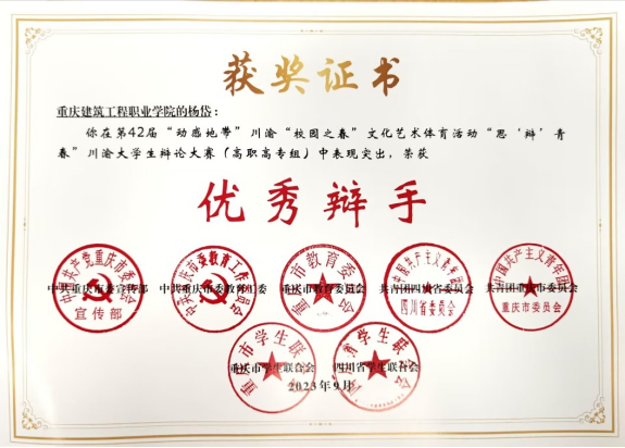 我校辩论队在“思‘辩’青春”川渝大学生辩论大赛(高职高专组)中表现突出,荣获季军。其中我校杨岱同学荣获优秀辩手。